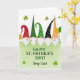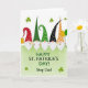 This card shows five friendly gnomes lined up across the upper half, their long pointed hats and fluffy white beards forming a cozy row that feels like a group photo between close friends 💚. Their simple faces show only small noses, so your eye goes straight to the hats: one red with polka dots, one with green spirals, one black, one dark green, and one orange with candy-like stripes. The background is a soft pale-green gradient that suggests early spring, with small shamrocks scattered around like quiet confetti ☘️. On the far left, a gnome holds a golden tankard angled slightly forward, as if offering a shared toast to someone standing just outside the scene. On the far right, the last gnome has yellow and green balloons floating upward, their strings trailing behind his beard and adding lift to the layout. Centered below the gnomes, the words “HAPPY ST. PATRICK’S DAY!” appear in bold green letters, and “Step Dad,” sits underneath in a smaller matching green line. A few shamrock shapes frame the text area, and the balloons arc up along the right edge while the tankard gleams near the left edge.