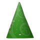 This paper party hat is green with lighter green swirls and a gnome with a white beard inside a red Christmas stocking between candy canes and holly leaves. Customize the Merry Christmas text with the template.