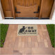 Funny Trendy Go Away Cat Doormat with Modern Faux Burlap Background. Custom designed mat with the words "Go Away" written in a cool black typography font. This funny cat lover door mat will surely delight every guest who encounters it.