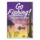 Go Fishing! Funny vintage or retro style travel poster of a fisherman on a lake during the evening sunset.