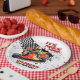 Trendy, modern Go Kart birthday party paper plates. Design features typography script ''It's Race Time'' in red lettering , colourful go kart rider illustration, and chequered flag pattern on a white and black background. Personalize with a name and age in trendy capital lettering. Suitable for any age.