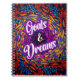 Goals and Dreams Notebook - a Self Care Journal with a colorful abstract art design, and retro, vintage-style lettering. Orange, gold, purple, hot pink, blue, and white.