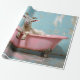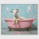 A whimsical painting featuring a white goat with horns relaxing in a vintage pink bathtub, set against a light blue wall for a charming and playful rustic scene.