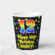 Cette conception joyeuse et colorée de tasse en papier sur le thème de l'anniversaire comporte un grand nombre "12" avec un motif inspiré par un gradient de spectre arc-en-ciel. Il comporte également le message "Joyeux 12e anniversaire", et un nom personnalisé. L'arrière - plan est décoré d'un motif coloré avec de nombreuses formes étoiles avec des couleurs et des tailles différentes. Des tasses de papier colorées et vibrantes comme celle-ci peuvent être amusantes à avoir lors d’une fête d’anniversaire qui a lieu pour honorer le douzième anniversaire de quelqu’un. [~Z0000540]