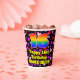 This cheerful and colorful birthday-themed paper cup design features a large number “16” with a rainbow spectrum gradient inspired pattern, along with the message “Happy 16th Birthday,”, and a personalized name. The background features a pattern of purple, pink, and red heart shapes of various sizes. Upbeat, happy paper cups like this might be fun to use at a birthday celebration/party being held to celebrate somebody’s sixteenth birthday. [~Z0000548]