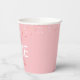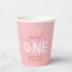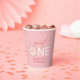 Ces tasses en papier sont conçues pour la fête du 1er anniversaire d'une fille. Le texte moderne dit "doux ONE" accentué d'un beigne dépoli rose et d'arroses. Personnalisez avec le nom de l'enfant.