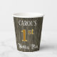 Ce design élégant et orné de tasse en papier sur le thème de l'anniversaire comporte un nom personnalisé et le message "1er Anniversaire fête". Le grand numéro "1er" présente un motif de coloriage imitation/faux d'inspiration or, les mots "fête d'anniversaire" sont dans un texte de style script sophistiqué, et l'arrière - plan a un look imitation bois/imitation. De luxueuses tasses en papier comme celle-ci pourraient être utilisées lors d’une fête d’anniversaire pour célébrer le 1er anniversaire de quelqu’un. [~Z0000568]
