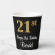 Cette conception élégante, élégante et luxueuse de tasse en papier à thème d'anniversaire comporte un grand numéro ordinal "21st" avec un motif dégradé faux/imitation or, ainsi que le message de voeux d'anniversaire "Happy 21st Birthday", et un nom modifiable dans une police de style script. L'arrière - plan est noir de couleur. Des tasses de papier comme celle-ci peuvent être utilisées à une fête d'anniversaire pour quelqu'un qui fête son vingt et unième anniversaire. [~Z0000538]