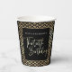 Élégantes tasses en papier noir, blanc et or pour une fête de 30e anniversaire.
