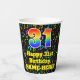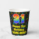 Ce design de gobelet en papier d'anniversaire à thème musical amusant et gai comporte un grand nombre de "31" avec un dégradé arc-en-ciel inspiré motif, avec le message "Happy 31st Birthday," et un nom modifiable. L'arrière - plan dispose d'un motif coloré avec des notes de musique et des symboles de différentes tailles et couleurs. Des tasses en papier colorées et vibrantes comme celle-ci peuvent être amusantes à avoir lors d’une fête d’anniversaire ou d’une fête qui a lieu pour célébrer le trente et unième anniversaire de quelqu’un. [~Z0000541]