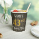 This elegant and luxurious birthday themed paper cup design features a custom name and the message “43rd Birthday Party”. The large number “43rd” has an imitation/faux gold-inspired coloring pattern, and the words “Birthday Party” are in fancy script-style text. The background has an imitation/faux woodgrain-inspired appearance. Opulent, ornate paper cups like this might be useful at a birthday party being held to celebrate somebody’s 43rd birthday. [~Z0000568]