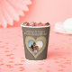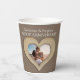 Personnalisez ces tasses de papier fête anniversaire de mariage de bois avec vos propres noms de couples d'anniversaire de 5e mariage, photo, date et années de mariage. D'autres articles correspondants sont disponibles. Art graphique et design en bois sculpté pour effet cardiaque par Sarah Trett pour www.mylittleeden.com et www.mylittleedenweddings.com
