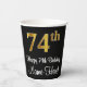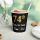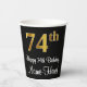 Cette conception élégante, élégante et sophistiquée de tasse en papier à thème d'anniversaire comporte un grand numéro ordinal "74th" avec un look faux/imitation or, ainsi que le message de voeux d'anniversaire "Happy 74th Birthday," et un nom personnalisé dans une police de style script. Il dispose également d'une arrière - plan de couleur noire. Des tasses de papier comme celle-ci peuvent être utilisées lors d’une fête d’anniversaire organisée pour célébrer le 74e anniversaire de quelqu’un. [~Z0000538]