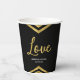 Ces tasses en papier modernes sont décorées d'un élégant chevron géométrique et du mot "Amour" en fausse feuille d'or contre un arrière - plan noir, parfait pour une fête d'engagement ou une fête d'anniversaire. Personnalisez-le en remplaçant le texte de l'espace réservé par vos propres informations. Pour plus d'options comme changer la police et sa taille/couleur ou l'espacement entre les lettres cliquez sur le bouton "Personnaliser". *Veuillez noter que le filigrane Zazzle qui apparaît dans l'aperçu du zoom n'apparaîtra PAS sur le produit imprimé final. © Bois de rose et agrumes