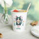 Cute kawaii chat couleur turquoise assis entre deux vases de fleurs et le coeur de chaque côté avec le texte dit Amoureux des chats. C'est un grand cadeau pour les amoureux de les chats.