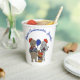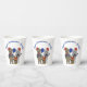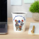 Cette tasse de fête personnalisée présente de jolies illustrations d'animaux habillés en vêtements français. Il y a un ours brun, un petit lapin ou lapin brun et un caniche gris portant des chemises rayées bleues et blanches classiques avec des bérets rouges et des neckerchiefs rouges. Au-dessus de l'illustration se trouve un endroit pour ajouter votre propre message en français ou dans n'importe quelle langue.