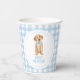 Anniversaire de l'extracteur en or de chiot avec arc bleu et plaid bleu.