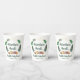 Des tasses en papier de baby shower rustique représentant une jolie illustration d'animaux boisés campant avec leur tente dans les montagnes et la forêt, un couvert d'étoiles dorées, et "Adventure Awaits" et le nom de la future mère en écriture vert foncé.