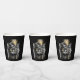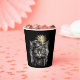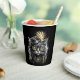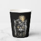 A fierce looking dark gray and black pussy cat wearing a leather hat with steampunk brass on it. A bronze feather tops the cock-eyed hat. This beautiful feline is wearing a golden or amber lensed monocle giving one eye a bronze tone, Around the cats neck hangs a brass trinket of some kind adding to the overall Steampunk attire.