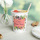 Jolis gobelets en papier pour enterrement de vie de jeune fille ou mariage réalisés en blanc, avec des fleurs sauvages colorées. Une zone de texte corail et or, des deux côtés, comporte un texte personnalisé en écriture noire. Personnalisez le texte pour répondre aux besoins de votre événement.