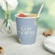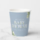 Une élégante tasse en papier baby shower garçon avec typographie chic et joli feuillage botanique sur un arrière - plan bleu poussiéreux. Conçu par Thisisnotme©