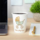 De mignons tasses en papier baby shower sans sexe qui présentent une aquarelle de bébé vert menthe pastel et or rétro rétro et le nom de la future mère dans un script élégant. Personnalisez le texte sur le chariot de bébé ou laissez vide.