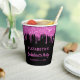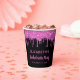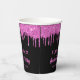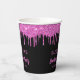 Des tasses en papier personnalisées et amusantes pour votre soirée de bachelorette avec une fausse parties scintillant rose vif et brillante qui coule un arrière - plan noir et "Bachelorette Party" dans un script rose vif. Vous pouvez personnaliser avec votre nom et votre date de fête.
