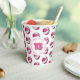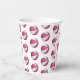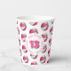 Ces tasses de papier de fête de basket-ball ont plusieurs petites boules de basket roses et blanches disposées en simple motif à goutte - le texte sur un graphique en cercle blanc peut être customisé, actuellement le nombre 13 pour représenter l'âge d'un enfant encerclé par les mots "Joyeux anniversaire" - par katz_d_zynes