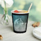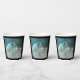 Tasses en papier avec une photo d'un magnifique loup gris et velouté. Dans l'arrière - plan est une forêt sombre avec des arbres. Vibe mystique magique.