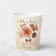 Un bébé brasse l'automne baby shower customisé monogrammed tasses en papier modèle, aquarelle chocolat chaud café cannelle épices biscuits feuilles d'érable, arrière - plan marron pour automne thème baby shower personnalisé vaisselle personnalisée tasses en papier.