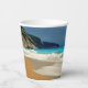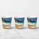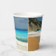 Des tasses en papier avec une belle photo représentant une mer bleu turquoise et une plage de sable avec des vagues de surf mousse.