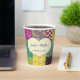 Un graphique en forme de coeur couleur crème avec bordure imprécise est placé contre un arrière - plan de courtepointe en patchwork floral sur ces tasses en papier qui ont un look chaleureux et coloré et sont parfaits pour les mariages de style boho. La forme du coeur est prête à être personnalisée avec les noms de la mariée et du marié et leur date de mariage.