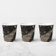 Beau design festif de tasse en papier avec étoiles dorées stylisées, cordes et bokeh sur arrière - plan noir.