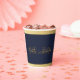 Élégantes tasses en papier d'anniversaire doré faites dans un bleu marine, avec des bordures dorées et chic or fleurissent, avec le nombre 50. Des fournitures de fête d'anniversaire correspondant sont disponibles.