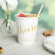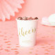 Style moderne Mariage papier d'or Cupsavec titre 'Cheers' en or police de script moderne avec nom et date dans la police sans serif moderne sur arrière - plan blanc.
