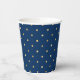 Motif à point de polka doré, tasses de papier de fête. Des points en feuille d'or sur bleu marine.