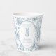 Elegant 'A little bunny is on the way' themed spring Easter baby boy shower paper cups featuring cute blue toile pattern with little bunnies, spring flowers and butterflies. Perfect for sweet French style baby boy celebrations.