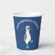 Ces tasses personnalisées de fête d'anniversaire en papier sont prêtes à être personnalisées avec votre propre message. Ils sont parfaits pour les fêtes d'anniversaire pour les amateurs d'oiseaux. Ils présentent une illustration de style dessin animé d'un joli oiseau botté aux pieds bleus dressé contre un arrière - plan bleu.