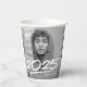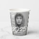 Coupes de papier modernes de graduation avec la photo du diplômé avec "2025" affichée en blanc, écrit à la main avec un tiret ci-dessous. Personnalisez les tasses de papier photo en ajoutant le nom du diplômé et le nom de l'école. Le dessin se répète à l'arrière. Les tasses personnalisées sont parfaites pour les fêtes de fin d'études secondaires et collégiales !