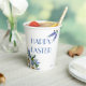 Poursuivez votre thème de Pâques bleu et blanc avec les tasses en papier coordonnées qui comportent un arrangement de fleurs printanières, y compris les célèbres "Lillies de Pâques" blanches et les fleurs bleues, allant du bleu de fleurs de maïs à une teinte presque pourpre. Le texte "Bonne Pâques" et la date sont dans les nuances de bleu cornflower.