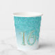 Une élégante parties scintillant bleue turquoise tombant sur le côté d'un arrière - plan bleu turquoise dégradé avec une grande parties scintillant numéro 16 correspondante à l'arrière de la tasse.