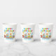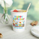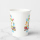 Cet adorable animal de cirque train heureux fête d'anniversaire tasse de papier met des animaux zoo dehors sur un safari. Le train contient une girafe, un éléphant, un tigre et un hippopotame mignon au-dessus du monogramme de vos enfants, écrit dans des couleurs cool orange, vert, rouge et bleu.