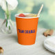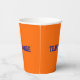 Tasses en papier avec base orange et bleu foncé design de texte personnalisé "Team Orange". Il est maintenant simple de personnaliser avec votre propre nom d'équipe, le logo de la ville, etc. Conception par Alma Wad.
