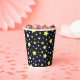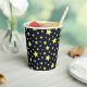 Tasses en papier avec un motif étoilé jaune contre un arrière - plan central bleu foncé. Ils fabriquent de grandes tasses pour n'importe quelle fête. Pour ajouter du texte, cliquez sur personnaliser. *Veuillez noter que le filigrane Zazzle qui apparaît dans l'aperçu du zoom n'apparaîtra PAS sur le produit imprimé final. © Bois de rose et agrumes