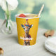 Une charmante petite girafe habillée pour une fête, portant un casquette festif aux motifs colorés et aux décorations moelleuses. La girafe possède un boa en plumes multicolores et moelleux et se dresse contre un arrière - plan jaune vif, créant une scène joyeuse et fantaisiste.