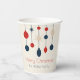 Cute retro Joyeuses tasses en papier de fête de Noël avec des ornements de style 70 vintages en rouge, bleu et ivoire au-dessus de votre nom de famille. Beau décor de vacances nostalgique pour vos dîners.