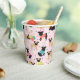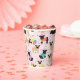 Cute birthday party Pug dogs with black and tan coats dressed in cute birthday outfits with balloons, cake and confeti pattern.