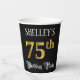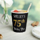 Ce design luxueux et élégant de tasse en papier à thème d'anniversaire comporte un nom personnalisable et le message "75e anniversaire fête". Le grand numéro "75ème" a un motif de coloriage imitation/faux d'inspiration or, les mots "fête d'anniversaire" sont dans un texte de style script sophistiqué, et l'arrière - plan est coloré noir par défaut (bien qu'il puisse être customisé). Des tasses de papier fantaisie et ornées comme celle-ci pourraient être utiles lors d’une fête d’anniversaire ou d’une célébration pour célébrer le 75e anniversaire de quelqu’un. [~Z0000567]