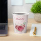 Joli mug en papier romantique avec des fleurs roses et roses poudrées et quelques feuilles vertes .
