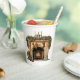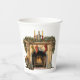 Tasses en papier avec une illustration chaleureuse et cosy avec une cheminée à l'ancienne. Embrassage suspendu avec soin. Garland suspendu au-dessus du manteau. Un feu chaud rugissant dans le foyer.